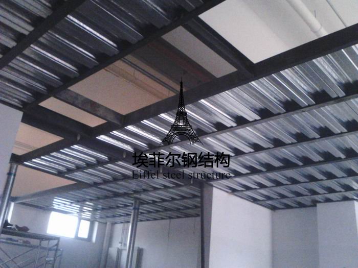 二、钢结构框架铺设镀锌成型钢楼板,再绑扎钢筋网2层,然后浇筑混凝土。铺设水泥压力板部分要注意楼板两边搭接要搭接在钢龙骨的主梁上,不要搭接在空处。铺板时注意板与板之间最好留3mm的伸缩缝,使用防水伸缩建筑胶作为填缝剂。使用自攻螺丝钉固定,使用自攻螺丝钉将楼板固定在钢龙骨上。
