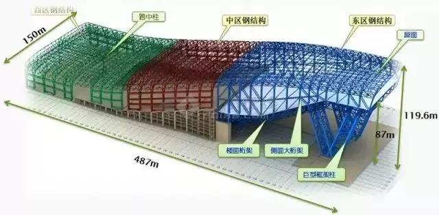 其中东区是三区中最为复杂和独特的部分,他是冰舞鞋隽秀的鞋跟!东区滑道层楼面结构仅由2根V型巨柱支撑,侧面大桁架及屋面结构均支撑在滑道层楼面上。巨型柱跟部中心尺寸 13.5米,楼面桁架结构中心线间距为10米,屋面桁架结构中心线间距为8米。