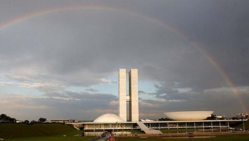 巴西议会大厦矗立于巴西首都巴西利亚市的核心三权广场上,是由巴西建筑师奥斯卡·尼迈耶(Oscar Niemeyer)设计,整幢大厦分为参议院、众议院会议大厅和办公楼3部分,由纵横两条轴线组成,水平、垂直的体形对比强烈。参议院、众议院会议大厅的外形均是半球体,一仰一覆放置,犹如两只巨大的“碗”;而中间的办公大楼则是由两座细长的高楼连接而成,犹如一双“筷子”,整座建筑相互协调,巧妙地组合在一起,看上去就像一组“组合餐具”,引人入胜。