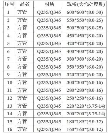 方管是一种空心方形的截面轻型薄壁钢管,也称为钢制冷弯型材。它是以Q235热轧或冷轧带钢或卷板为母材经冷弯曲加工成型后再经高频焊接制成的方形截面形状尺寸的型钢。热轧特厚壁方管除壁厚增厚外情况,其角部尺寸和边部平直度均达到甚至超过电阻焊冷成型方管的水平。