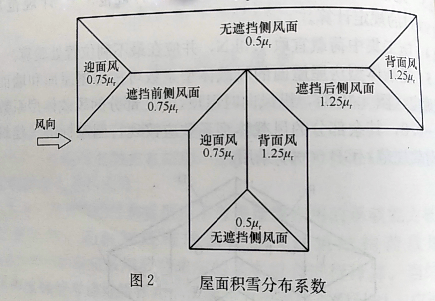 ƒ对侧风面屋面:在屋面无遮挡情况时,侧风面屋面积雪分布系数取0.5µr;在屋面有遮挡情况时,遮挡前侧风面积雪分布系数取0.75µr;遮挡后侧风面屋面积雪分布系数取1.25µr。