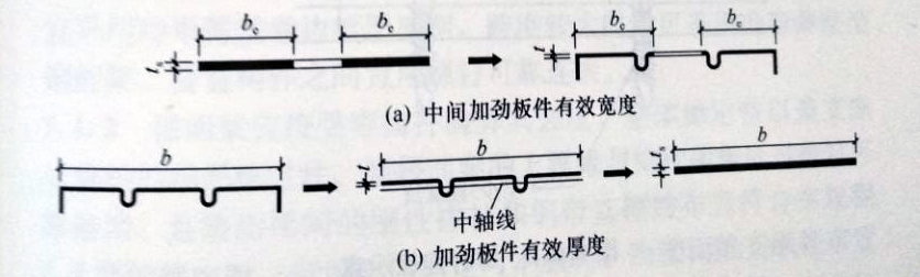 7 中间加劲板件宽度可按等效板件的有效宽度采用图a。等效板件厚度图b可按下式计算: