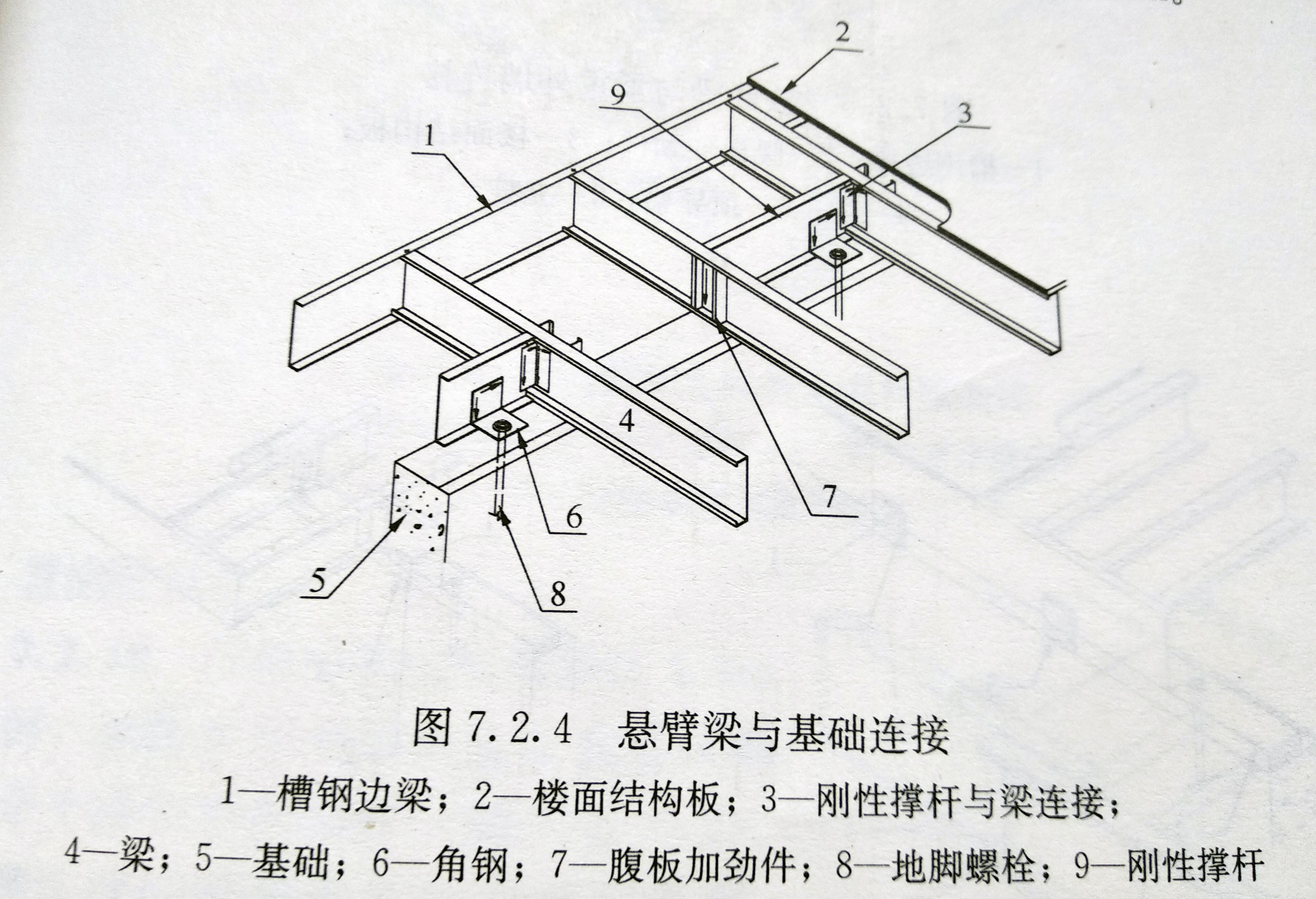 4、悬臂梁与基础连接采用图4所示的构造时,地脚螺栓规格和布置形式与本规程第2条规定相同。在悬臂梁间每隔一个间距应设置刚性撑杆,其中部用连接角钢与基础连接,角钢应至少用4个螺钉与撑杆连接,端部与梁应至少用2个螺钉连接。刚性撑杆截面形式应与梁相同,厚度不应小于1.0mm。