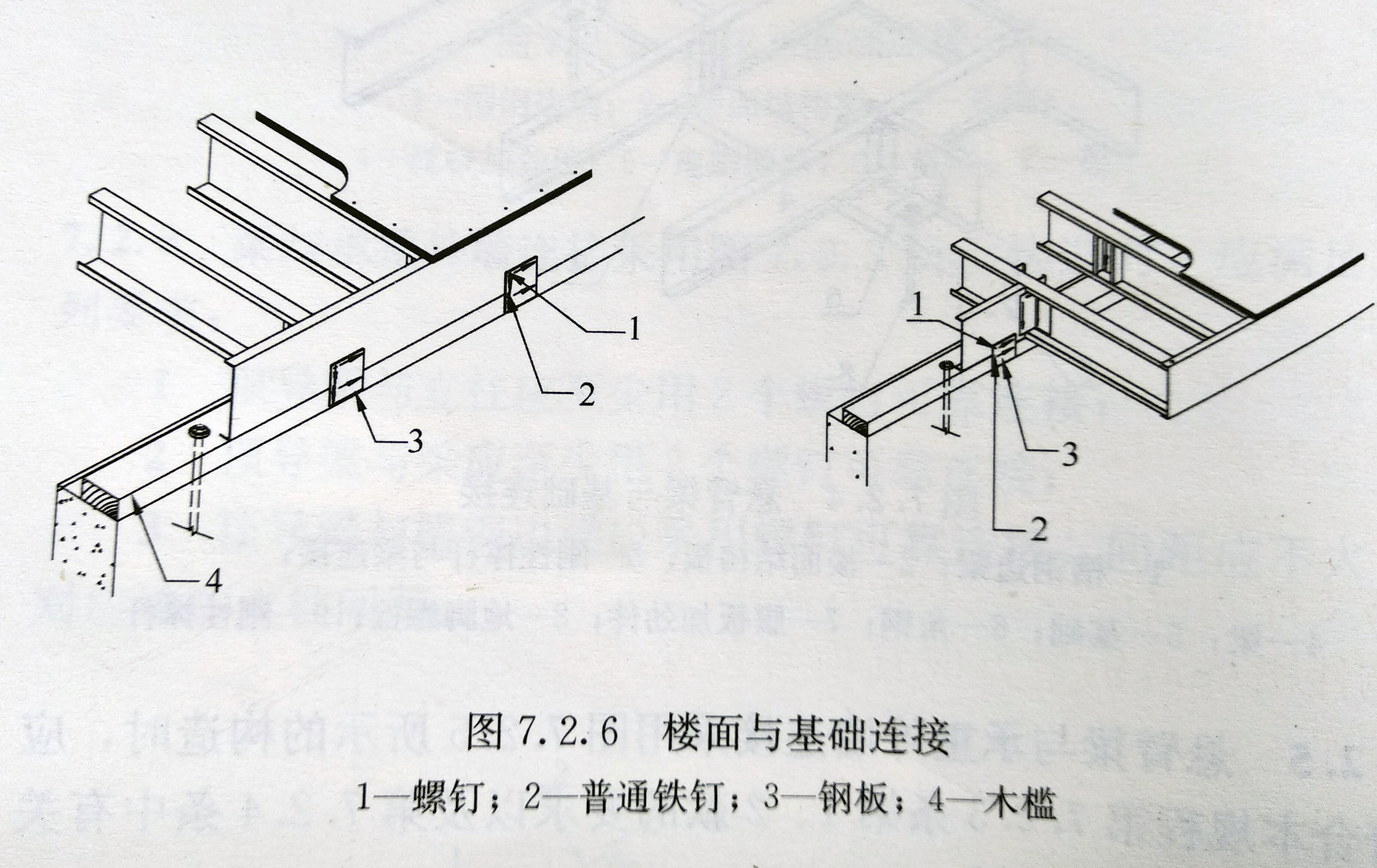 6、楼面与基础间连接采用图6所示设置木槛的构造时,木槛与基础应采用地脚螺栓连接,楼面边梁和木槛应采用钢板、普通铁钉或螺钉连接。地脚螺栓规格和布置形式应符合本规程第2条的规定,连接钢板的厚度不得小于1mm,连接螺钉的数量不得少于4个。