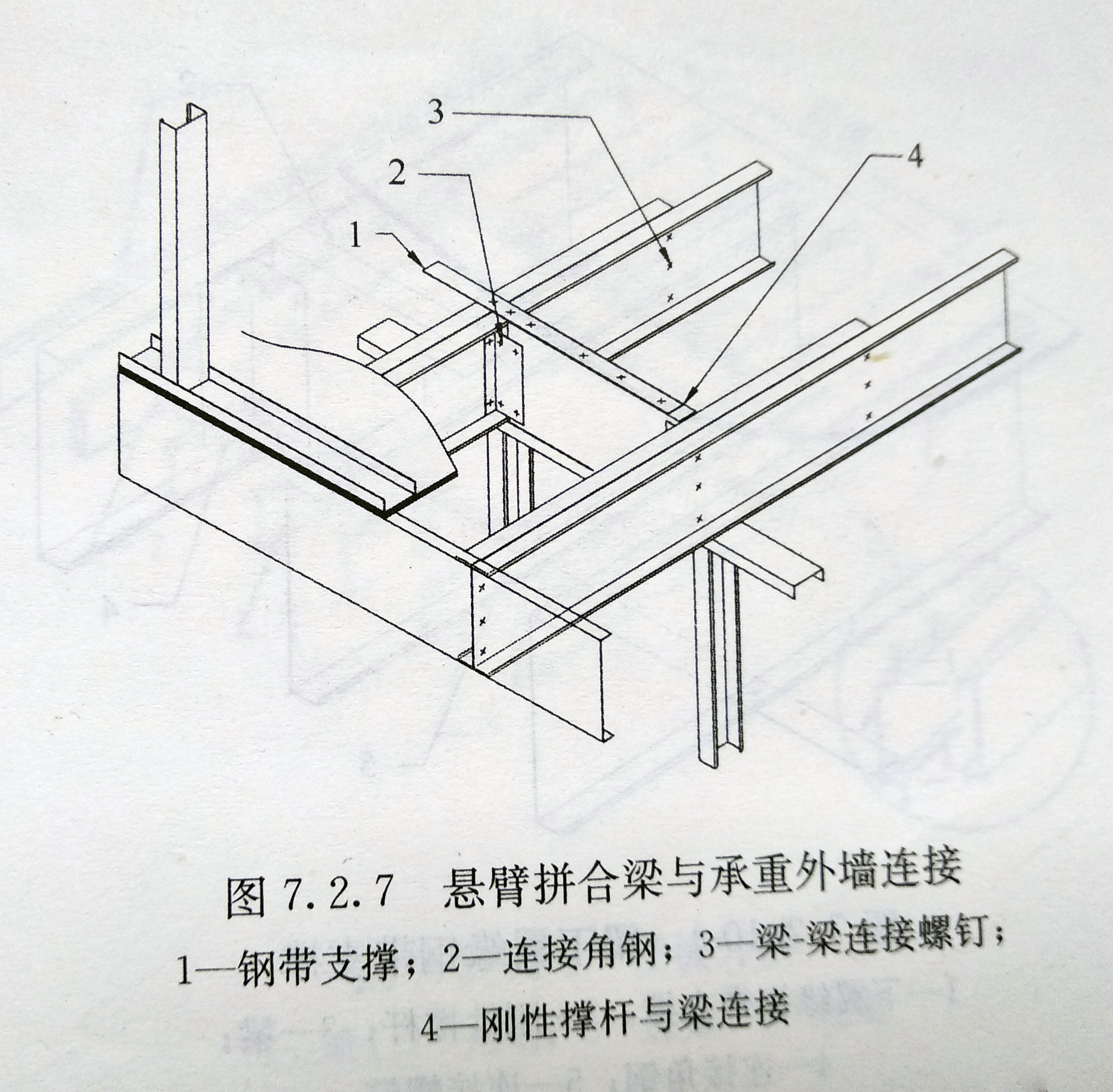 7、当悬挑楼盖末端支承上部承重墙体时(图7),楼面梁悬挑长度不宜超过跨度的1/3。悬挑部分宜采用拼合I字形截面构件,其纵向连接间距不得大于600mm,每处上下各应至少用2个螺钉连接,且拼合构件向内延伸不应小于悬挑长度的2倍。