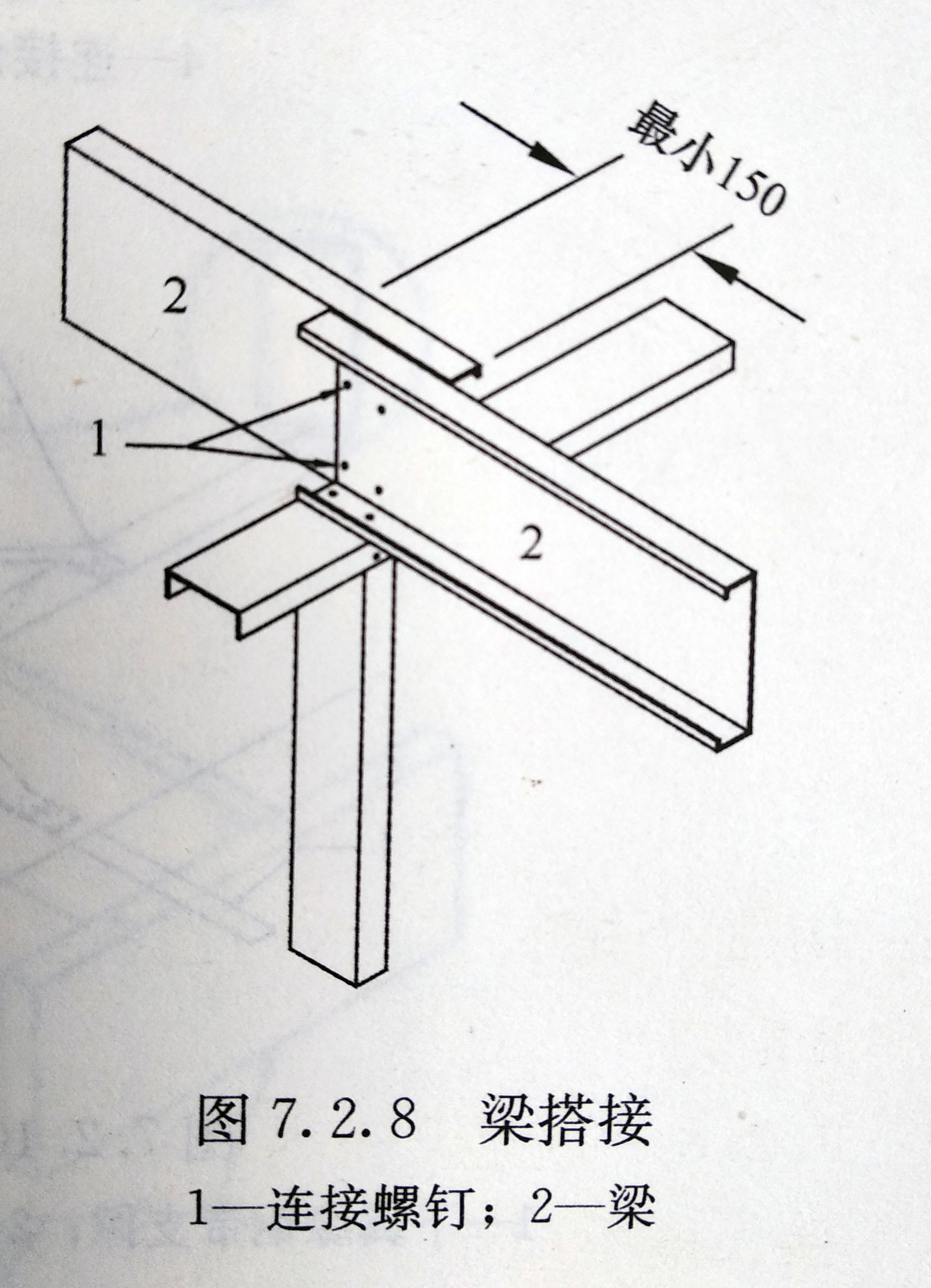 8、简支梁在内承重墙顶部采用图8所示的搭接时,搭接长度不应小于150mm,每根梁应至少用2个螺钉与顶导梁连接。梁与梁之间至少用4个螺钉连接。