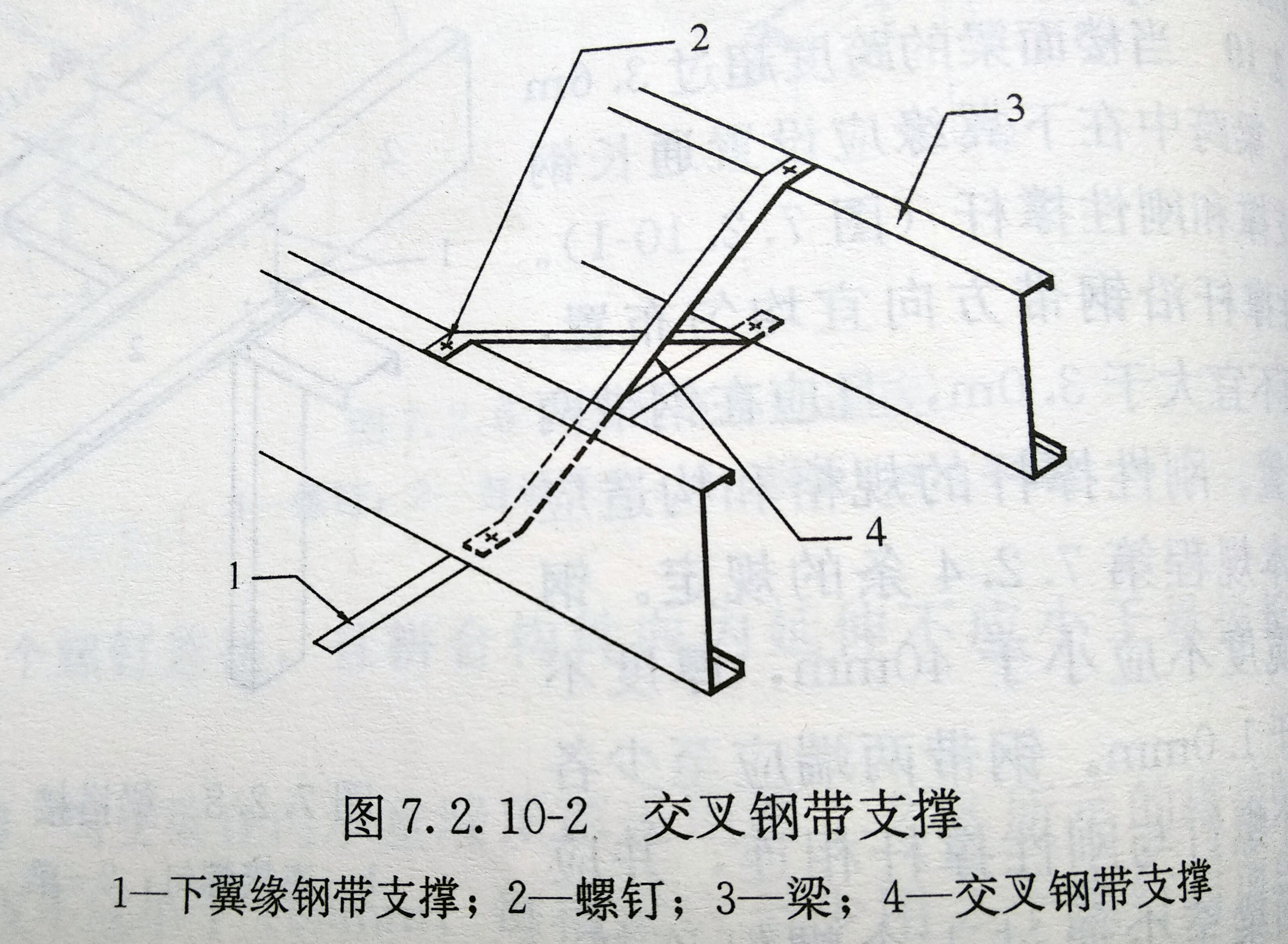 10、当楼面梁的跨度超过3.6米时,梁跨中在下翼缘应设置通长钢带支撑和刚性撑杆。(图10-1)。刚性撑杆沿钢带方向宜均匀布置,间距不宜大于3.0m,且应在钢带两端设置。刚性撑杆的规格和构造应符合本规程第4条的规定。钢带的宽度不应小于40mm,厚度不应小于1.0mm。 钢带两端应至少各用2个螺钉与刚性撑杆连接,并应与楼面梁至少通过1个螺钉连接。刚性撑杆可以采用交叉钢带支撑代替(图10-2),钢带厚度不应小于1.0mm。