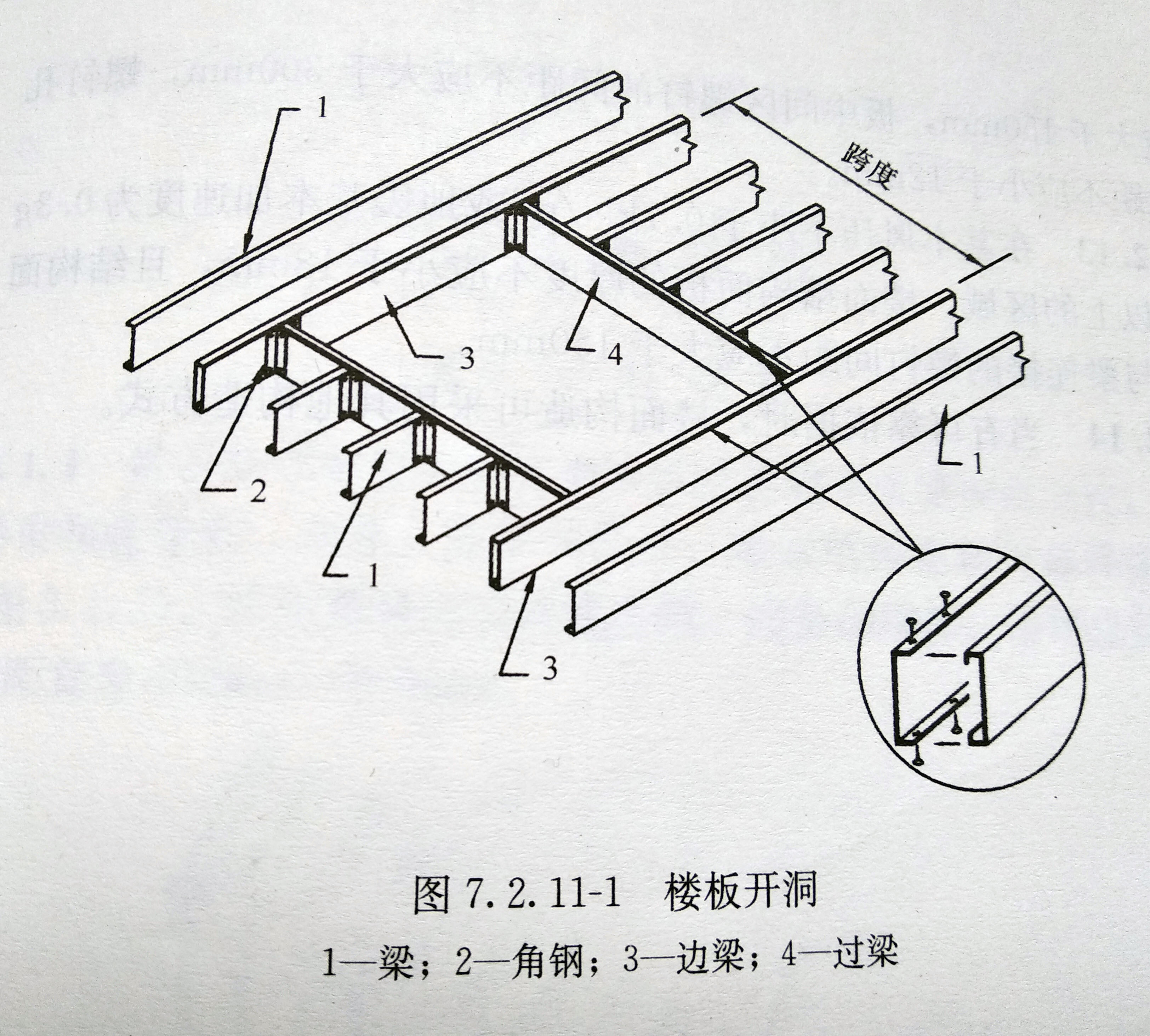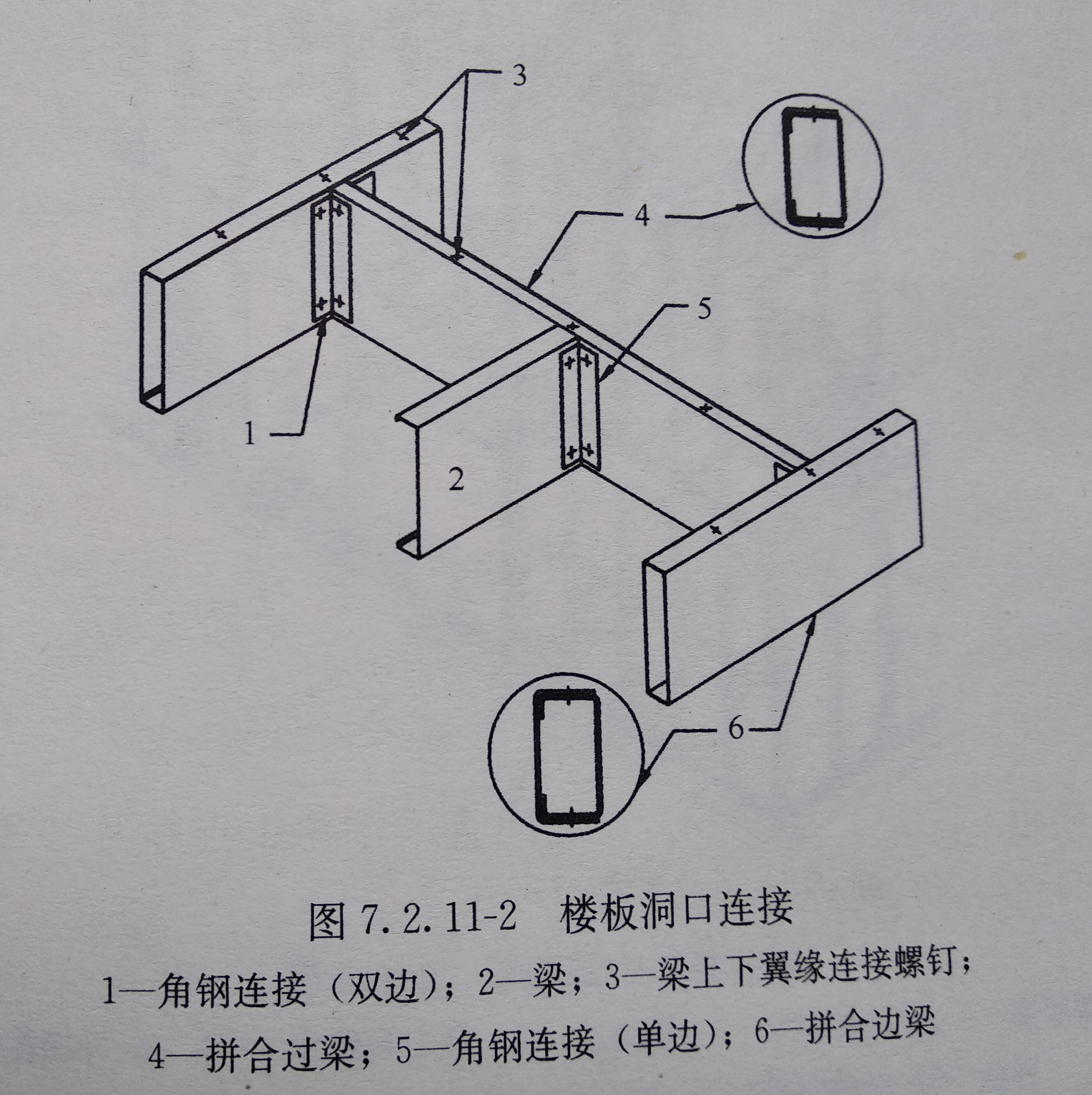 11、楼板开洞最大宽度不宜超过2.4m,洞口周边宜设置拼合箱形截面梁(图11-1),拼合构件上下翼缘应采用螺钉连接,间距不应大于600mm。梁之间宜采用角钢连接片连接(图11-2),角钢每肢的螺钉不应少于2个。