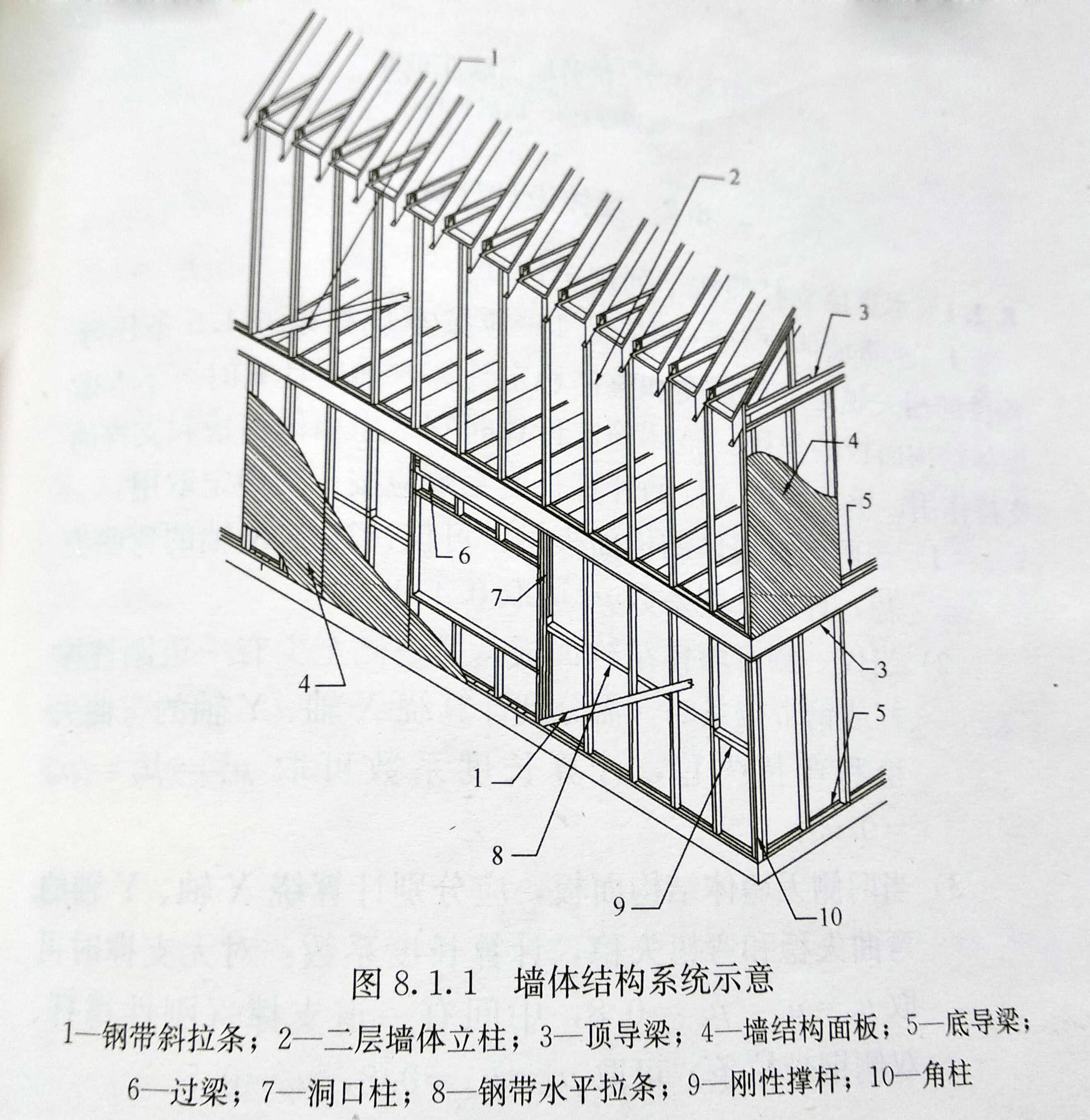 1、低层冷弯薄壁型钢房屋墙体结构的承重墙应有立柱、顶导梁和底导梁、支撑、拉条和撑杆。墙体结构面板等部件组成(图1)。非承重墙可不设置支撑、拉条和撑杆。 墙体立柱的间距宜为400mm到600mm。
