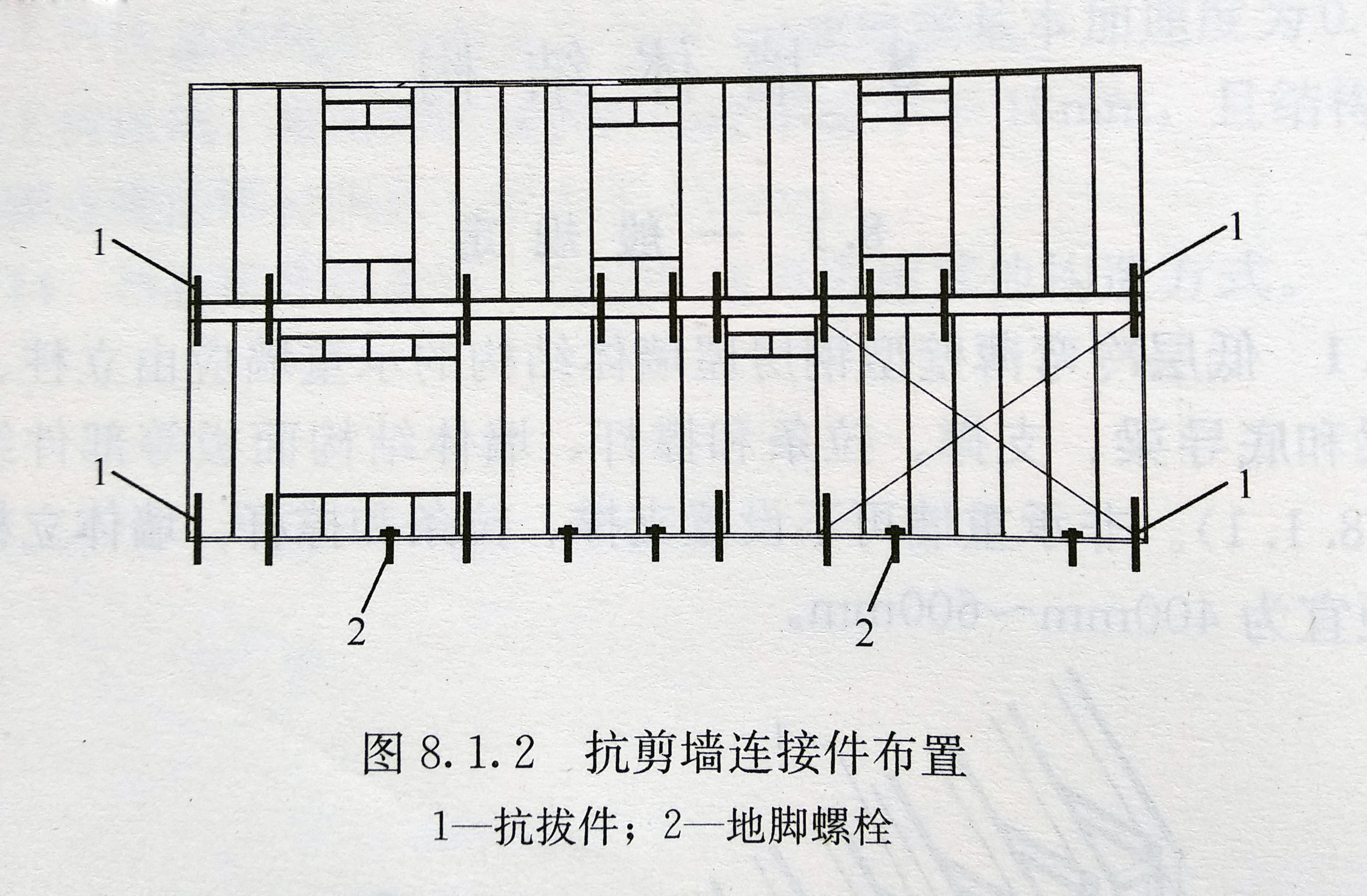 2、低层冷弯薄壁型钢房屋结构的抗剪墙体,在上、下墙体间应设置抗拔件,与基础间应设置地脚螺栓和抗拔件(图2)。