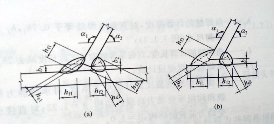 四、两焊脚边夹角α为60°≤α≤135°的T形接头,其斜角角焊缝(图2)的强度应按公式3至公式5计算,但取βf=1.0,其计算厚度为:he=hfcosα/2(根部间隙b、b1或b2≤1.5mm)或he=[hf-b(或b1、b2)/sinα]cosα/2(b、b1或b2>1.5mm但≤5mm)。