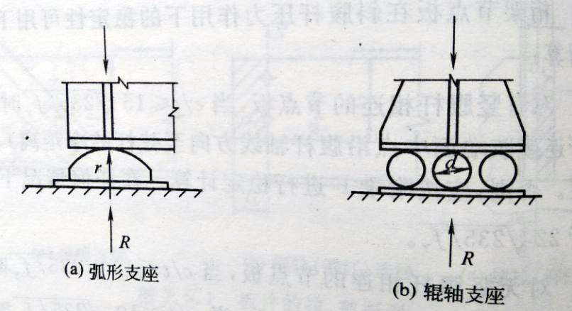 2、弧形支座(图1a)和辊轴支座(图1b)中圆柱形弧面与平板为线接触,其支座反力R应满足下式要求: