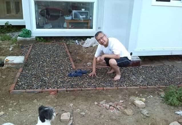 骨架搭建起来后,大叔需要做一定的美化和改善,比如搭建露台、修筑小路以及培育花草等等,大叔忙得不亦乐乎,像这个就是他在用红砖修筑小路。