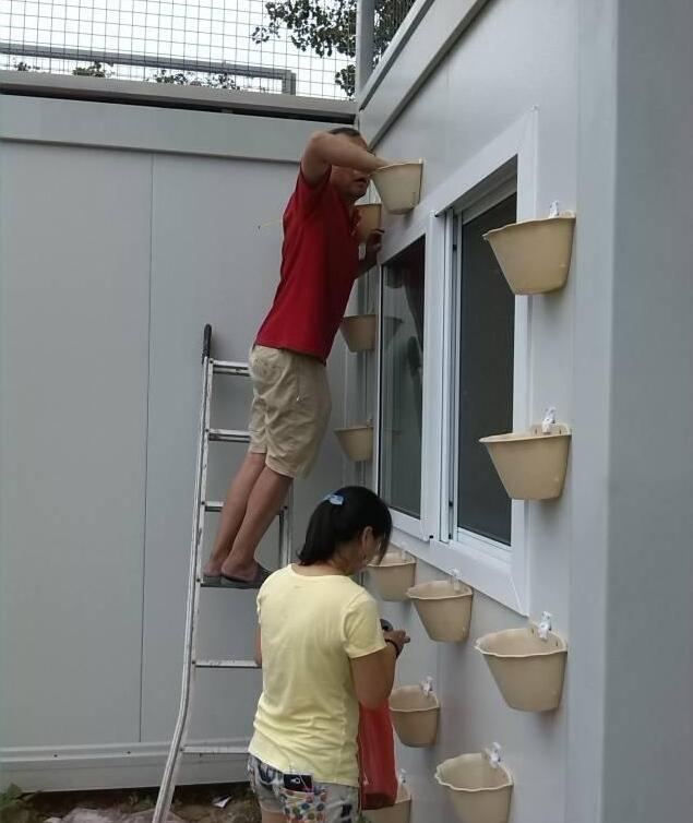 除了小路,还需要美化环境,就在集装箱的外面安装了一个个花架,等花草绿植长出来,效果非常惊艳。