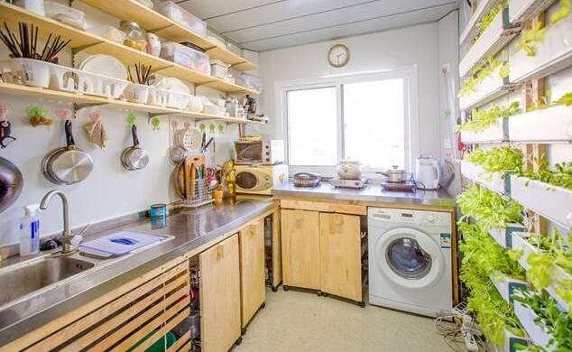 厨房效果,整体还是很实用的,收纳空间很大,洗衣机也塞到了这里。右边是培育蔬菜的管道。
