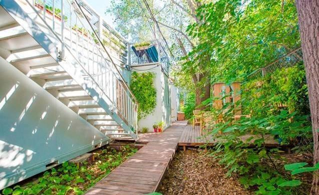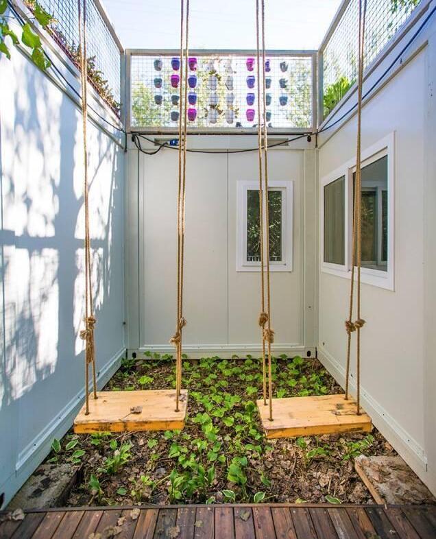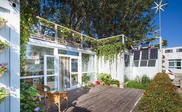 生活气息慢慢的环境,一同构成了这个家。这个由木板搭建起来的露台,特别适合放松休息。同时,集装箱上面的绿植,对整个建筑也起到了美化效果,单是看着就像一栋小别墅一样,很是气派。
