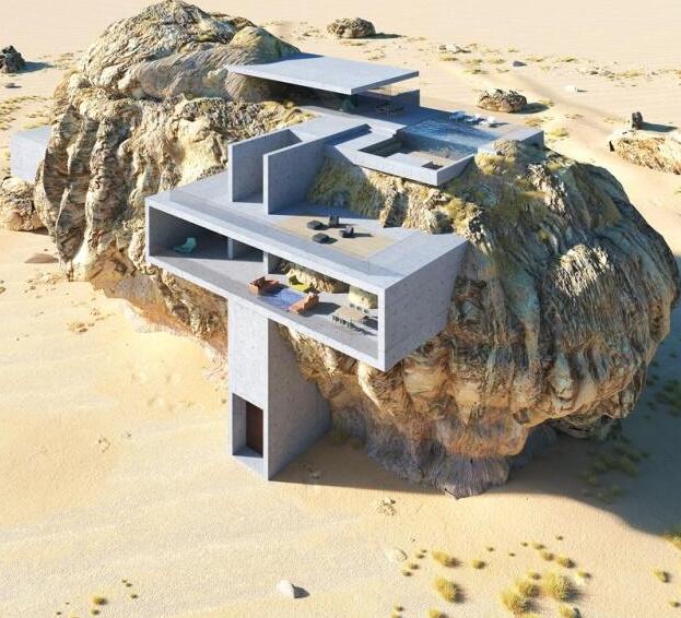 “岩石中的房子”设计灵感来自沙特阿拉伯马丹萨利赫城岩壁上的墓室。这位在上海的外籍建筑师Amey Kandalgaonkar阐释说:“考虑到沙特阿拉伯马丹萨利赫城坟墓遗址在岩石上的复杂性,用一种更简洁的平面和立体以获得视觉上的平衡是必要的。我着手在3D软件里创建岩石的模型,这是一个雕刻的过程。后来当将房子嵌入岩石中时,我努力使它在水平视角的效果最小化,只有在鸟瞰时,干预的真实程度才得以显现。”小编我非常欣赏这样的建筑设计,真可谓坚固、舒适、奇特引人!
