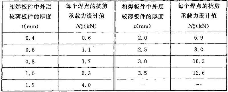 4.2.6 电阻点焊每个焊点的抗剪承载力设计值应按表4.2.6采用。
