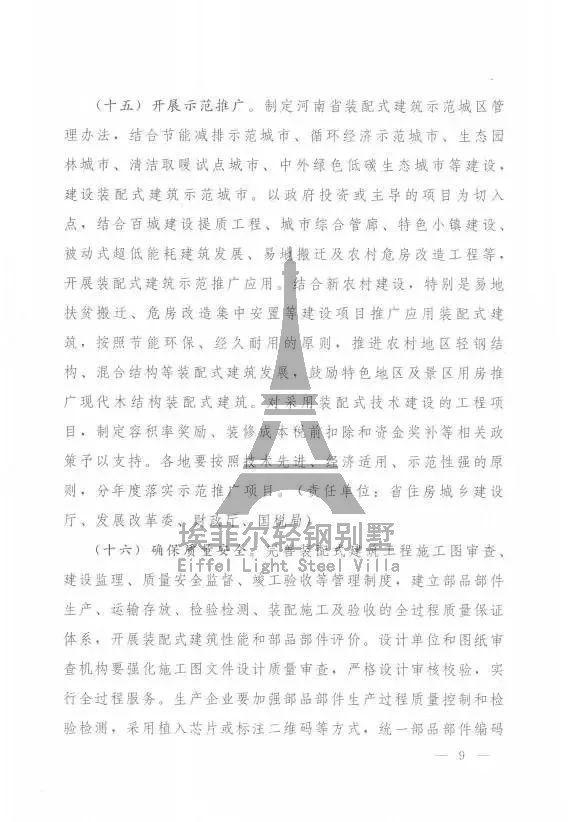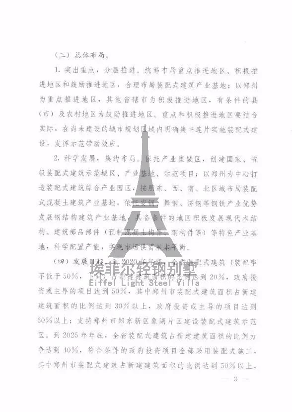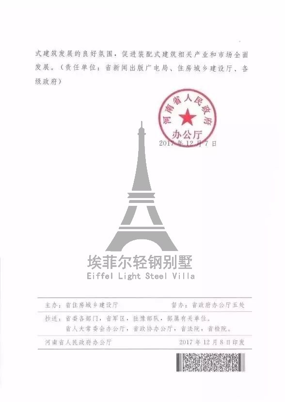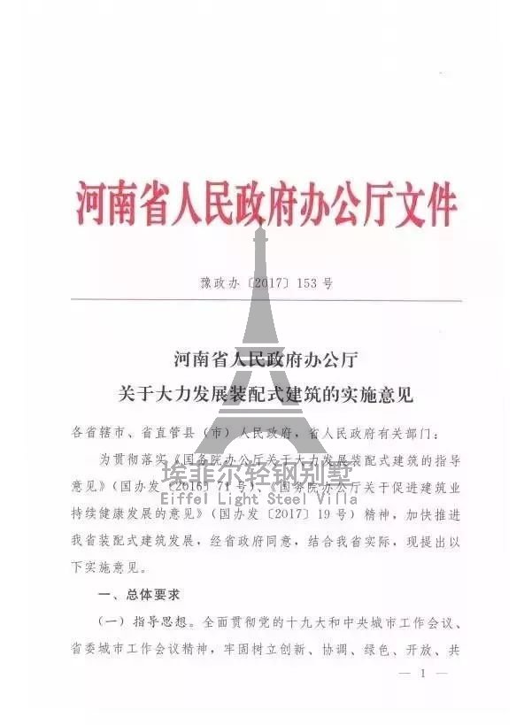 河南省人民政府办公厅印发了《关于大力发展装配式建筑的实施意见》(豫政办〔2017〕153号,以下简称《实施意见》